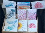 These are prints of hand painted artworks, enhanced by a luxurious feel, printed on 300gsm textured 100% recycled card.